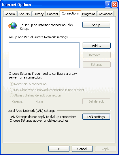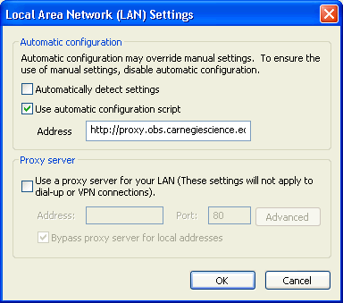 Select LAN settings to bring up the LAN connection settings dialog. Check Use automatic configuration script and then enter http://proxy.obs.carnegiescience.edu/proxy.pac into the text box: